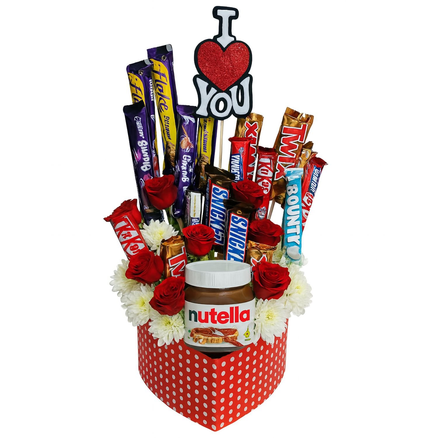 Mixed "I Love You" chocolate heart box includes: Cadbury Flake Bar, Snickers, Nutella, Bounty, Twix, KitKat, Red roses and Chrysanths