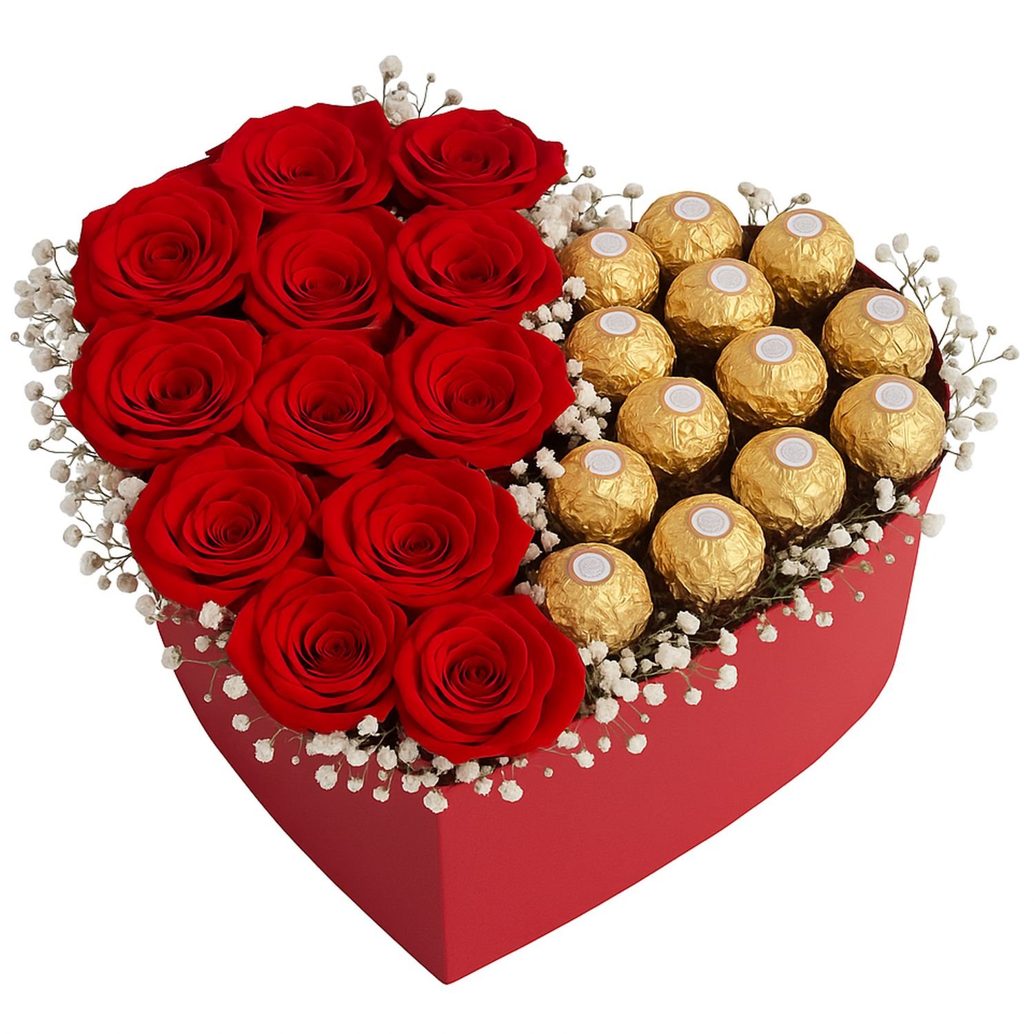 This romantic heart-shaped box combines deep red roses with golden Ferrero Rocher chocolates. A beautiful way to say I love you.