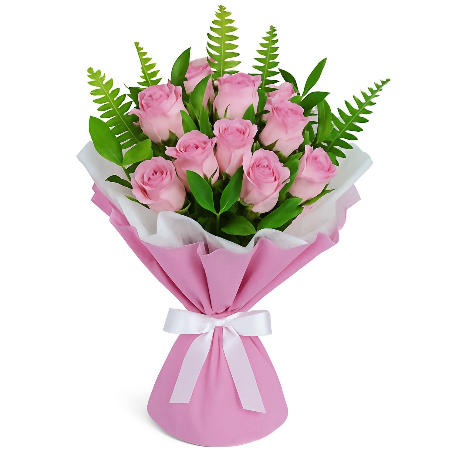 Delight someone special with this luxurious pink rose bouquet. Featuring hand-selected pink roses, accented with fresh greenery, and wrapped in stylish pink and white paper tied with a satin ribbon, this arrangement is both modern and romantic.