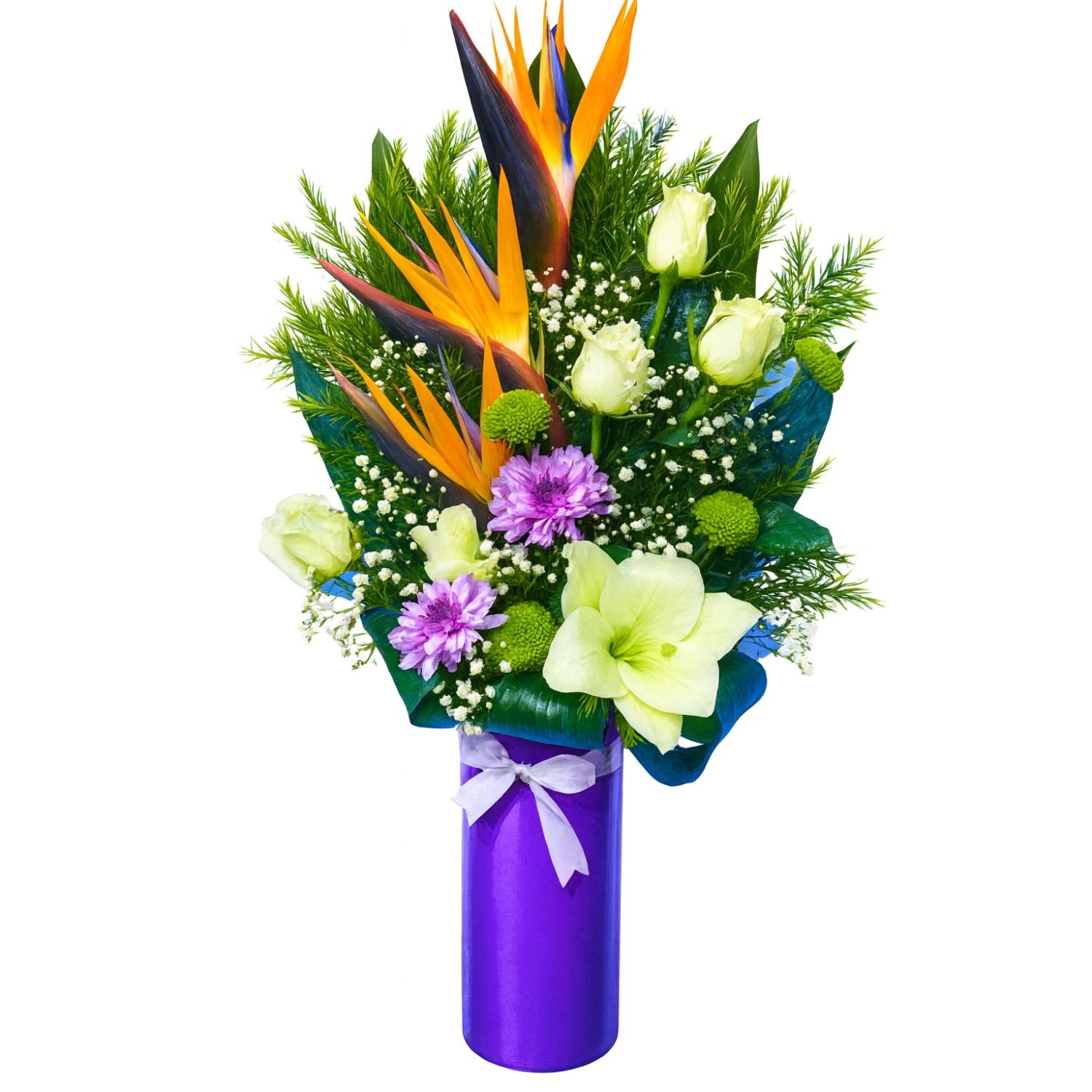 Bring a touch of tropical elegance to any occasion with this exquisite Bird of Paradise & Rose Arrangement from Azhaar Flowers.
